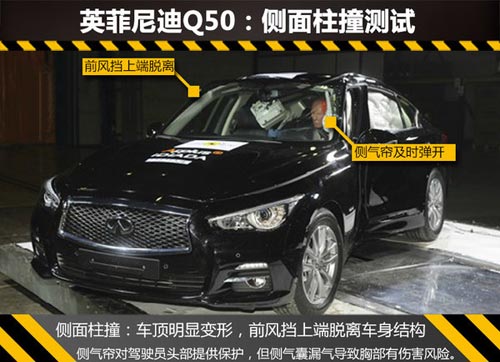 在最為嚴苛的柱撞測試中,英菲尼迪Q50因保護模擬假人胸部和骨盆的側(cè)安全氣囊位置不正確,這兩個身體部位在側(cè)面柱撞測試中時被扣分。撞擊時側(cè)氣簾及時彈出對駕駛員頭部形成良好保護,碰撞后車頂明顯變形,前風擋上端脫離車身結(jié)構(gòu)。測試后發(fā)現(xiàn),可以保護胸部和骨盆的側(cè)氣囊的通氣孔刮住車門內(nèi)裝飾部件上并被撕裂,引發(fā)側(cè)安全氣囊更快的放氣,由此降低了對駕駛員身體的保護。所以模擬假人的胸部得分較低,有受到傷害的風險。柱撞滿分為8分,Q50的成績僅為6.3分,寶馬3系為7.4分。