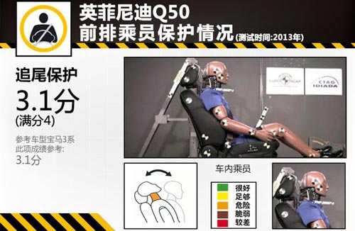 在模擬追尾碰撞時對車內(nèi)乘員頸部保護的測試中,英菲尼迪Q50和寶馬3系的座椅以及頭枕均能在追尾碰撞事故時為車內(nèi)乘員提供良好的保護,避免頸椎過度屈伸的損傷。此項測試滿分為4分,兩車均取得了3.1分的一致成績。