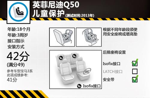 兒童保護是評定一款車型的重要標準之一,在正面和側(cè)面碰撞測試中,兒童座椅中的18個月和3周歲模擬假人都受到充分的保護。在兒童座椅安全接口提示和安裝方式方面,英菲尼迪Q50在后排座椅提供了兩個ISOFIX接口,安裝指示的各種標識都非常清晰。此車副駕駛安全氣囊也可以關閉,以便允許在座位上使用背向式兒童安全座椅,并且能為駕駛員提供清晰的使用方式以及警示信息。兒童保護測試成績滿分為49分,Q50成績?yōu)?2分,3系成績?yōu)?1分。