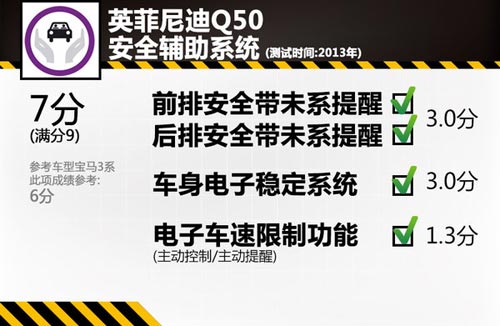 在車輛安全輔助系統(tǒng)測試中,考核內(nèi)容為車速限制、ESP車身穩(wěn)定系統(tǒng)以及前后排安全帶未系提示4項,每項裝配技術都將決定最終分值的高低。Q50全部配備了以上4項安全輔助系統(tǒng),并且達到了測試要求。寶馬3系的電子車速限制系統(tǒng)因是選裝配置,所以該項測試沒有得分。車輛安全輔助系統(tǒng)測試滿分為9分,Q50的成績?yōu)?分,高出3系1分。