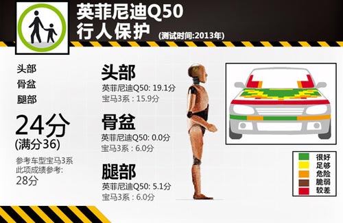 英菲尼迪Q50擁有配備了傳感器的智能發(fā)動機罩,當傳感器檢測到行人被撞時,發(fā)動機罩會自動升起保護行人頭部,車輛的速度和行人的身高在一定范圍內(nèi)時這項功能會正常啟用。此車在發(fā)動機罩升起的位置進行了行人碰撞測試,測試結(jié)果顯示行人的頭部碰在整個發(fā)動機罩表面上可得到充分保護,A柱底端則是危險區(qū)域。行人頭部保護Q50得分較高,為19.1分,超過寶馬3系3.2分。但發(fā)動機罩前端區(qū)域卻對行人骨盆有造成傷害的危險,骨盆保護成績僅為0分,對行人骨盆保護還有待提高。此外Q50的保險杠對行人的腿部提供了基本的保護。腿部保護成績滿分為6分,Q50為5.1分,3系則為滿分。