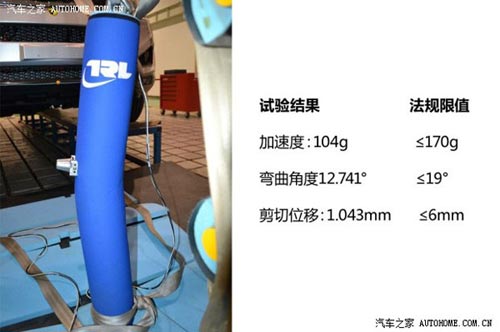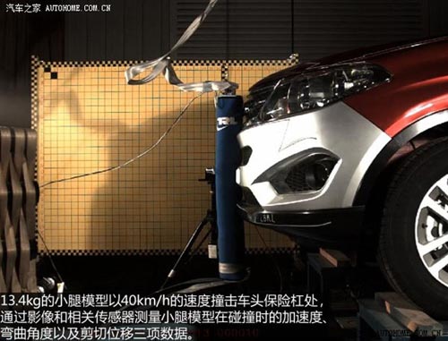 13.4kg的小腿模型以40km/h的速度撞向車頭保險杠處,測量小腿模型在碰撞時的加速度、彎曲角度以及剪切位移三項數據。