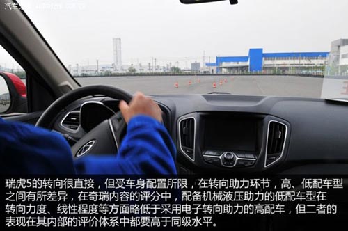 S型操穩路主要體驗車輛在遇到緊急情況時車輛的操控性能,首先要說明的是,由于產品定位原因,高配的瑞虎5車型裝配的是帶有EPS隨速轉向功能的電子轉向助力系統,而我們所體驗的這輛搭載手動變速箱的車型屬于低配版本,受成本所限,轉向助力系統采用機械液壓結構。從奇瑞內部對采用兩種不同轉向助力形式的車型的打分來看,電子助力系統比機械液壓助力系統在轉向力、相應、線性方面都要更好些。