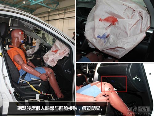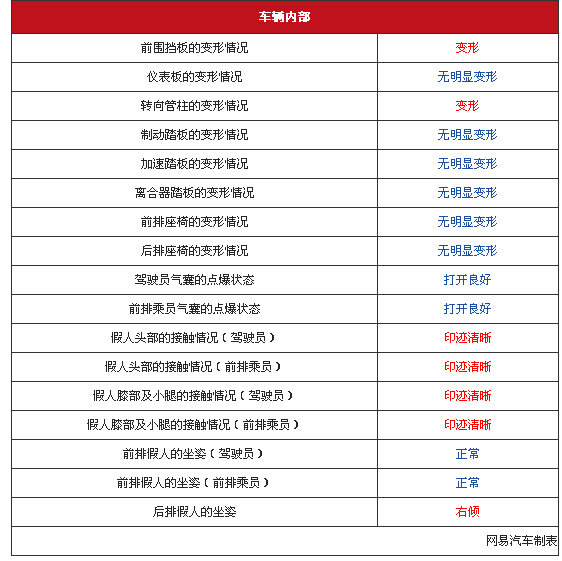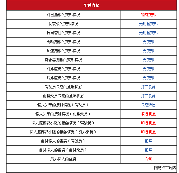 碰撞后,前排雙氣囊彈出,頭部與氣囊接觸,痕跡明顯;前排駕駛席假人腿部與前艙明顯接觸;副駕駛假人腿部與前艙有明顯接觸痕跡!