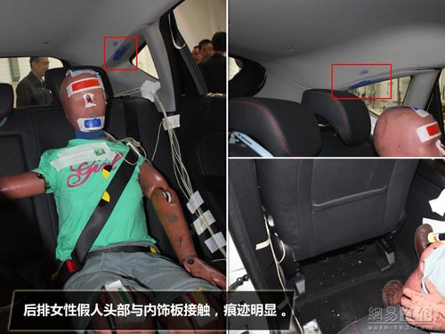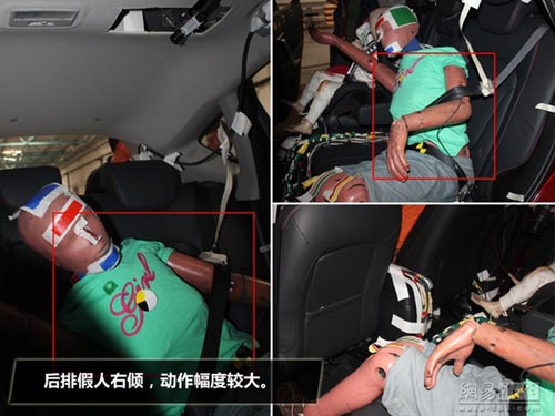 后排女性假人頭部與上頂梁內飾板接觸,痕跡明顯,安全帶緊扣;手臂有不規則擺動,假人具體的受傷情況還需等待試驗數據分析。
