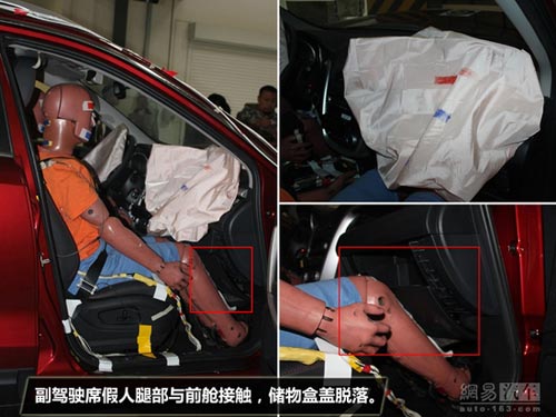 碰撞后,前排駕駛席假人坐姿正常,安全帶緊扣假人身上,氣囊正常打開,頭部與氣囊接觸印跡清晰;假人腿部與前艙接觸;前排乘員假人坐姿正常,頭部與氣囊接觸,痕跡明顯;腿部安全試驗點中,腿部與儲物盒接觸痕跡明顯,儲物盒蓋變形脫落。