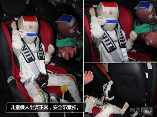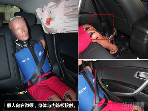 后排假人向右微傾,身體與車門內飾板接觸,留有明顯接觸痕跡;安全帶緊扣假人身上,具體受傷情況還需根據安裝在假人身上的傳感系統來確定。