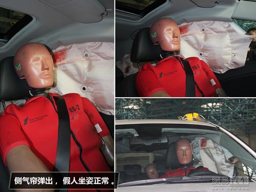 從現場來看碰撞時,側氣簾彈出,側氣囊偏離預設位置,被椅背擋住,沒有起到相應的保護作用;左側車身嚴重變形;前排假人坐姿正常,安全帶緊扣;后排假人運動幅度較大,身體與內飾板接觸,留有明顯接觸痕跡。