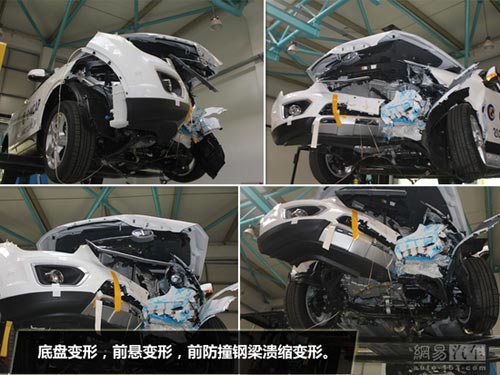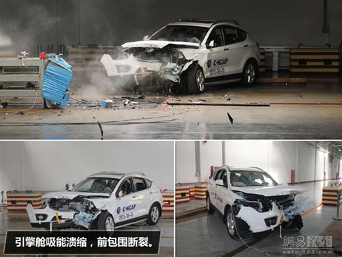 從試驗現場看整車向右后方倒退,前引擎艙潰縮變形,防撞梁變形,左縱梁變形,左前輪胎受到擠壓,被扎破;副駕駛席乘員假人腿部與前艙接觸痕跡明顯;后排假人頭部與上頂梁內飾板接觸,痕跡明顯!
