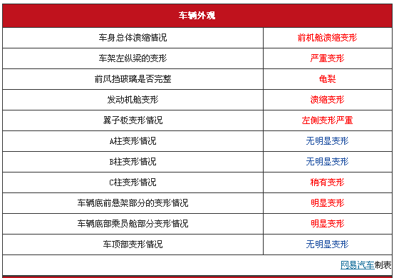 碰撞后,整車迅速向右后方呈一定弧度倒退,距離較遠;前引擎艙潰縮變形,近乎縮進一半;左前大燈破碎脫落;左側翼子板破碎,左前輪胎被扎破;A、B、C柱無明顯變形,車門可正常開啟,乘員可自行打開車門自救逃生。