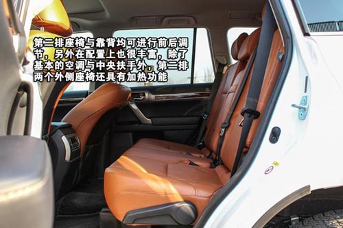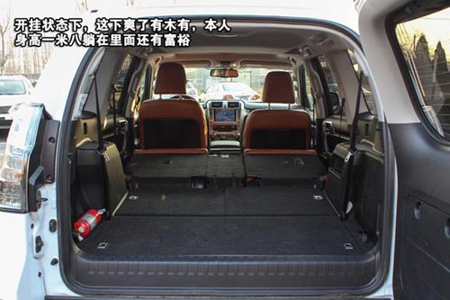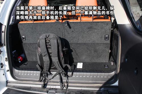 由于都擁有三排座椅,GX400的后備箱空間也可以算得上是靈活多變,縱深最長在180厘米左右,最短僅僅略長于一部手機(jī),放下一個書包都很困難。另外,備胎懸掛在底部,工具隱藏在后備箱門內(nèi)。
