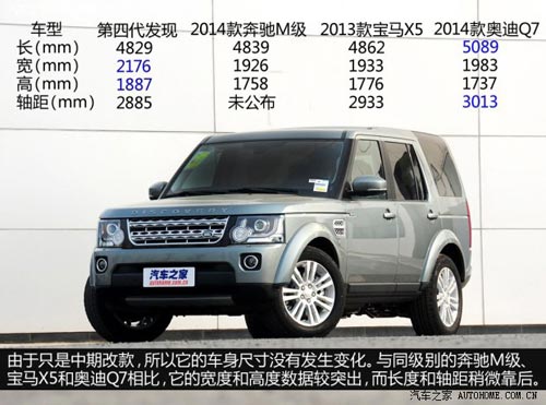 在2013年我們曾對百萬級SUV進行過一次大橫評,第四代發現在與奧迪Q7、寶馬X5、奔馳M級以及蘭德酷路澤等眾多強手的直接對話當中表現得游刃有余,憑借出色的綜合能力給大家留下了深刻印象。日前,它的新款車型已經來到我們身邊,新車除了對外觀細節進行調整,還進一步豐富了配置,意圖提升競爭力。據悉,2014款第四代發現將在近期正式上市。
