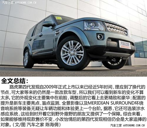 2014款第四代發現的變化固然談不上驚艷,但也算拿出了自己的誠意,尤其是配置的提升,進一步增強了自身實力。當然,對大家來說,最為期待的自然是它的價格,這將馬上揭曉,我們也會即時更新,敬請關注。