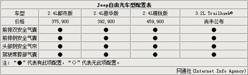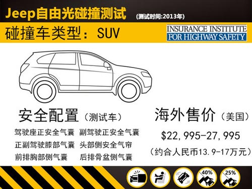 這次進行碰撞測試的全新Jeep自由光裝備有全方位安全氣囊,其中包括前排正面雙安全氣囊、頭部一體式側氣簾、正副駕駛席膝部安全氣囊、前排胸部側氣囊以及后排骨盆側氣囊。此車在美國的售價為22,995-27,995美元,折合人民幣約13.9-17萬元。全新自由光在國內已上市,其中2.4L排量共三款車型,售價375,900-459,900元,另一款3.2L排量車型尚未公布售價。新車全系標配了前排正面雙氣囊、前排側氣囊、頭部側氣簾以及駕駛席膝部氣囊。進口國內的自由光與美國本土銷售車型在氣囊配置上略有差異,但相比沃爾沃XC60來說,全系配備的駕駛席膝部氣囊是個亮點。