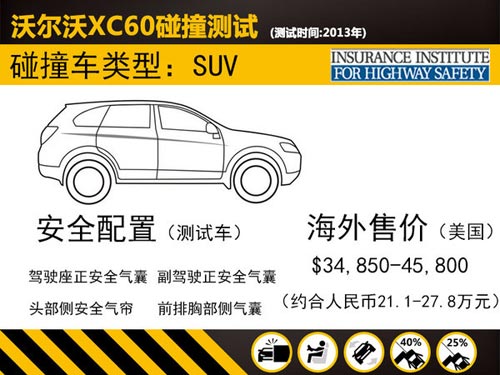 參加碰撞測試的沃爾沃XC60安全氣囊數量相對全新自由光要少些,只有前排正面雙安全氣囊、頭部一體式側氣簾以及前排胸部側氣囊,也許在沃爾沃看來這些已足夠了。美規的XC60售價為34,850-45,800美元,折合人民幣約21.1-27.8萬元。國內2014款XC60共8款車型,售價為389,900-669,900元。新車全系標配了前排雙安全氣囊、頭部一體式側氣簾以及前排胸部側氣囊。在安全氣囊配置上,國內銷售的沃爾沃XC60與美規參試車型一致。(注:美規沃爾沃XC60測試成績僅供參考)