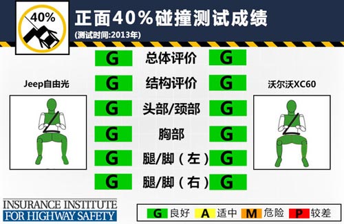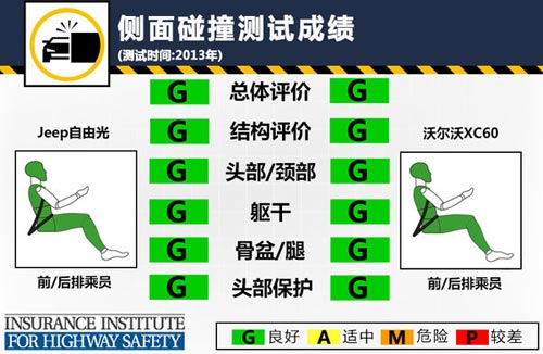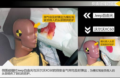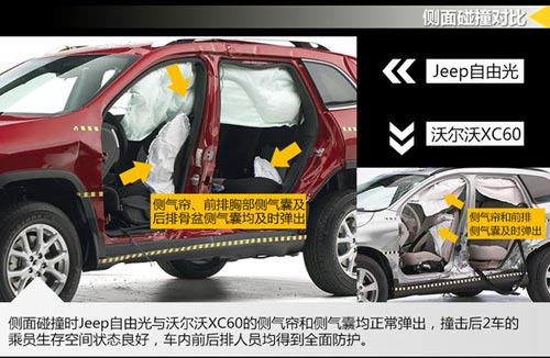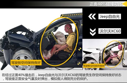 全新Jeep自由光在美國的這次碰撞測試中表現優異,對車內乘員保護非常到位,因此也獲得 IIHS“2013最高等級安全評定”(2013 Top Safety Pick)。沃爾沃則被公眾稱之為“世界上最安全的汽車品牌”,XC60的碰撞測試同樣優異,但從2車的成績對比我們可以看出,全新自由光在安全性上并不遜于沃爾沃XC60。