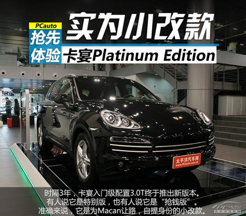 目前國內市場所銷售的卡宴為2011款,歷經3年的磨練之后,終于繼卡宴GTS之后推出卡宴Platinum Edition(俗稱鉑金版)。保時捷的鉑金版配置,最先出現在旗下帕納美拉(Panamera)上,其代表精益求精的升華產品,差異化在于加入專享定制化配置。難道卡宴走的也是這個路線?非也。用更準確的詞語來說的話,它是取代2011款卡宴3.0T(下稱:普通版)的小改款。