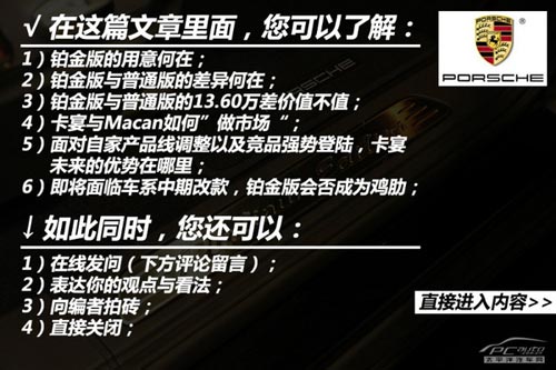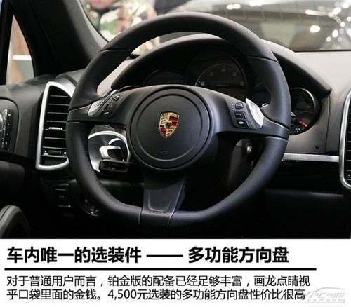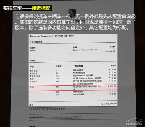 談回卡宴鉑金版。雖然比普通版要貴上13.60萬元,但實際上其差價都化成了實實在在的配置,這點可以從文章第一頁的表格中看到。至于如果你要問卡宴鉑金版的性價比如何?我可以回答你的是:它將會是國內銷售的卡宴中,最廉價的一款。13.60萬元是花定的,盡管你現在想回頭去選購普通版也是不可能的了。