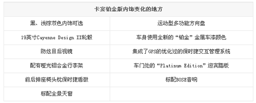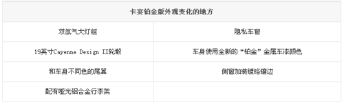 卡宴鉑金版具體發(fā)生了哪些變化,請先看下面表格,認清了這些今后在路上你就能輕易辨認出哪款車是鉑金版了。