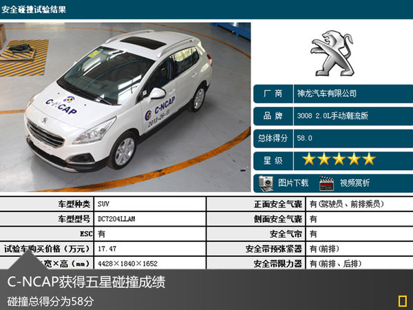 在國內C-NCAP對東風標致所產3008車型進行了碰撞測試,其成績達到58分,已超過五星評級的最低標準8分(≥50為五星評級)。而東風標致所提倡的“6+X”安全理念,則是3008車型取得高分的必要條件。其中數字6則指括預防安全、主動安全、被動安全、兒童安全、行人安全和防盜安全,而X則代表駕乘人員的安全意識。