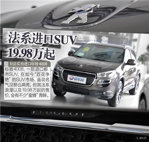 時下的SUV市場,從過去的"一枝獨秀"到如今的"百花爭艷",過去的"一枝"指的就是合資品牌SUV,如豐田RAV4、本田CR-V、大眾途觀等;如今的"百花",盡管合資品牌依舊耀眼,但自主品牌及純進口SUV開始了"含苞待放",甚至有些有"艷壓群芳"之勢,如長城哈弗系列。當然,"百花爭艷",美的是消費者,愁的是廠家,如今除了產(chǎn)品的不斷革新,價格也在不斷地下探,特別時下的SUV市場,從過去的"一枝獨秀"到如今的"百花爭艷",過去的"一枝"指的就是合資品牌SUV,如豐田RAV4、本田CR-V、大眾途觀等;如今的"百花",盡管合資品牌依舊耀眼,但自主品牌及純進口SUV開始了"含苞待放",甚至有些有"艷壓群芳"之勢,如長城哈弗系列。當然,"百花爭艷",美的是消費者,愁的是廠家,如今除了產(chǎn)品的不斷革新,價格也在不斷地下探,特別是純進口SUV車型,優(yōu)惠幅度越來越大,新上市的車型價格更沒那么高不可攀。接下來介紹的這款法系進口SUV--標致4008就是如此,起售價還不足20萬(官方指導價19.98萬至27.98萬)。