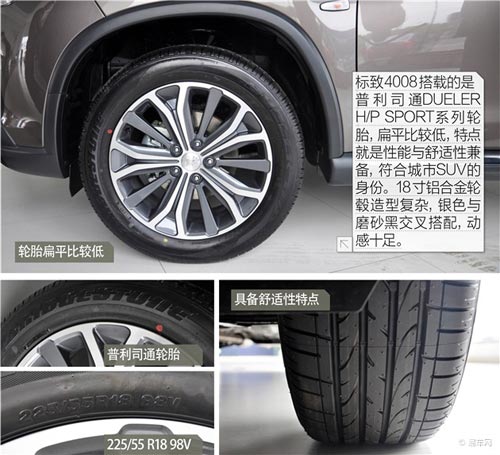 標致4008搭載的是普利司通DUELERH/PSPORT系列輪胎,扁平比較低,特點就是性能與舒適性兼?zhèn)?,符合城市SUV的身份,輪胎尺寸為225/55R1898V,18寸鋁合金輪轂造型復雜,銀色與磨砂黑交叉搭配,動感十足。