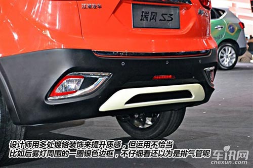 瑞風S3的尾部設計相比車頭要低調不少,整個線條圓潤而飽滿,黑素保險杠很粗壯。設計師用多處鍍鉻裝飾來提升質感,但運用不恰當,比如后霧燈周圍的一圈銀色邊框,不仔細看還以為是排氣管呢。