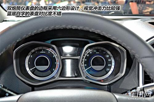 雙炮筒儀表盤的邊框采用六邊形設計,視覺沖擊力比較強,藍底白字的表盤對比度不錯。