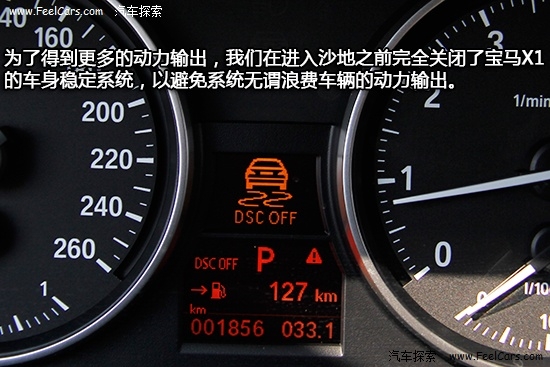 也許熟悉沙漠駕駛的網友們都知道,在進入沙漠駕駛之前,我們需要將駕駛車輛的胎壓降低,也就是放掉一部分輪胎中的空氣,增加輪胎與地面的接觸面積,幫助車輛獲得更多的抓地力。普通車輛在進入沙漠前需要將胎壓降低至1.0bar,再低可能會導致輪胎與輪轂出現脫圈的危險。而由于我們此次試駕的寶馬X1使用了防爆輪胎,在0胎壓情況下也可以在80公里/小時以內行駛近80公里的距離,因此我們在進入沙漠之前,將胎壓降低至0.5bar。此外,為了獲得更多的動力輸出,我們在進入沙漠之前會將車身穩定系統完全關閉,以避免系統偵測到打滑動作后進行制動,浪費車輛動力。另外,沙漠駕駛中的上下車也有一個小竅門,就是盡量保持單個車門的關閉,避免同時打開兩個車門之后在車內形成對流,卷進沙子。