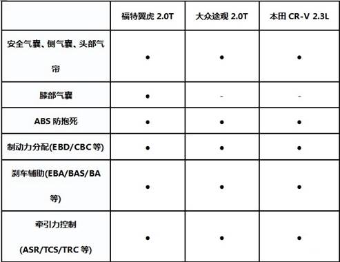 通過圖表我們能夠清晰的看出,無論是制動力分配系統(tǒng)、剎車輔助系統(tǒng),還是牽引力控制系統(tǒng)、車身穩(wěn)定系統(tǒng),福特翼虎、大眾途觀、本田cr-v都有配備。