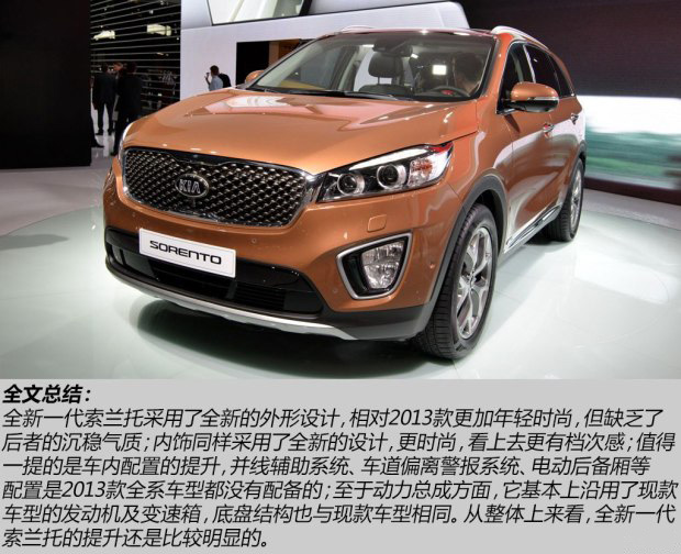 在我的印象里面,起亞索蘭托是一款性價(jià)比不錯(cuò)的進(jìn)口SUV車型。自2009年進(jìn)入國(guó)內(nèi)銷售以后,它憑借著原裝進(jìn)口的身份、豐富的配置以及寬敞的乘坐空間等特點(diǎn)積累了不少忠實(shí)的用戶。在2014巴黎車展上,起亞汽車帶來(lái)了索蘭托的全新一代車型。除了外形、內(nèi)飾設(shè)計(jì)的改變外,它的車身尺寸、配置等都有相應(yīng)的升級(jí)。