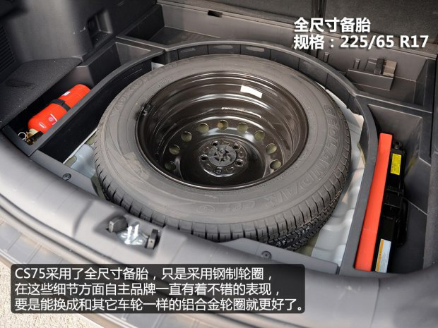 CS75采用了優科豪馬GEOLANDAR系列的輪胎,該系列產品是針對城市型SUV所做的。CS75的輪胎規格為225/65 R17,并且該規格的輪胎為全系標配。全尺寸的備胎對于自主品牌來說,已經是件很常見的事兒了,但對于廠家這種厚道的表現,還是要認可一下,與其它輪胎不同的是備胎采用了鋼制輪圈。