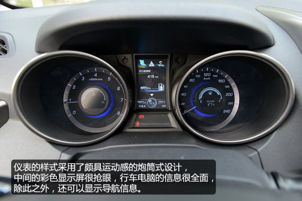 雙炮筒式的儀表盤很有運動色彩,儀表中央的彩色顯示屏可以顯示續航里程、綜合油耗、平均車速以及胎壓信息等內容。