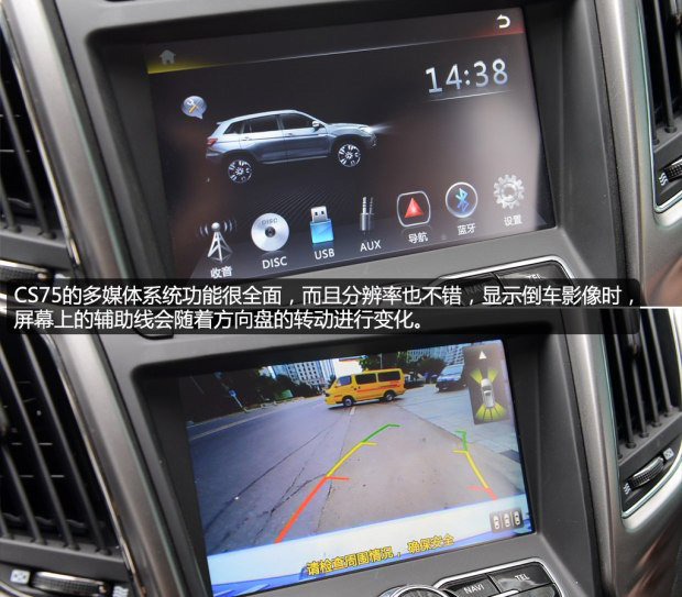 CS75的多媒體系統帶有導航、倒車影像等功能,倒車影像的輔助線會根據方向盤的轉動而變化,屏幕的分辨率較高,顯示的清晰度不錯。
