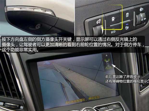 配置方面,我們測試的這輛手動領先型不僅配備了倒車影像、還帶有側方攝像頭,在側方停車的時候非常方便,可以讓駕駛者輕松的了解到右前方下面的情況。方向盤左側的除了側方攝像頭的開啟按鍵,還有ECO模式控制鍵,開啟ECO模式也就是開啟了發動機啟停功能,對于油門的反應等方面并沒有明顯的變化。