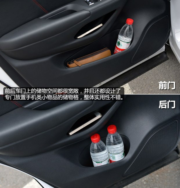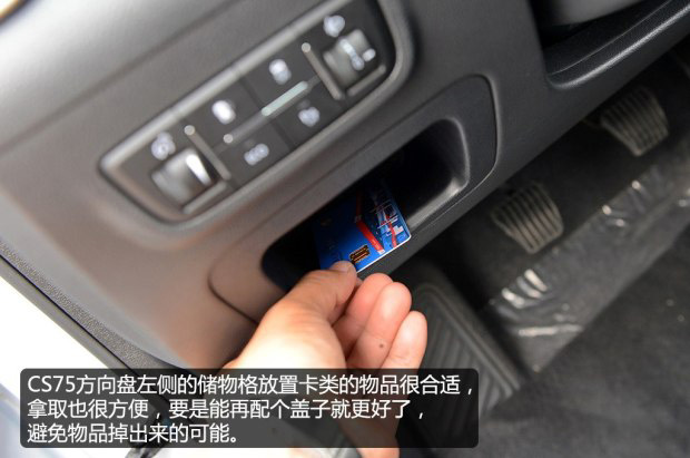 儲物空間方面,CS75前后門都有儲物格,而且還不止一個,下面放置水瓶位置的儲物空間表現很不錯,車門拉手下面的小儲物格適合放置手機類的小物品。