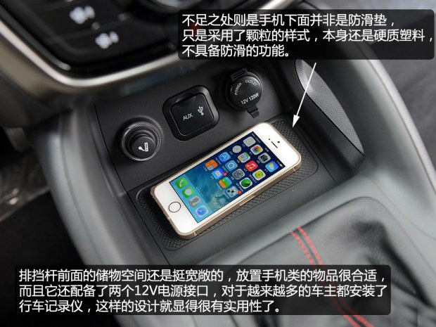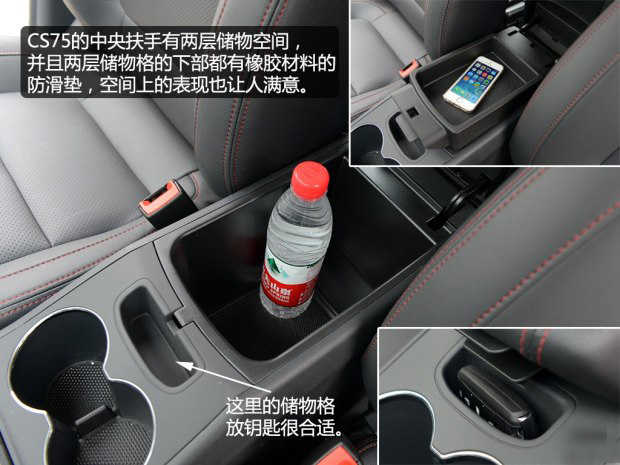CS75的手套箱空間夠寬敞,而且里面也很規整,但沒有照明燈,在夜晚使用時會感覺不夠方便。中控臺下方的儲物空間夠大,拿取物品很方便。不足之處就是杯架的設計,兩個杯架里面的高低設計不一樣,靠近駕駛員一側的杯架相對較淺,對水瓶的支撐要差一點。這還不是最重要的,關鍵是當放置500mL的瓶裝水時,會影響換擋,手臂剛好會碰到水瓶,感受不是很好。所以,這里的杯架,我們還是建議放置較小的瓶裝水或者聽裝飲料。