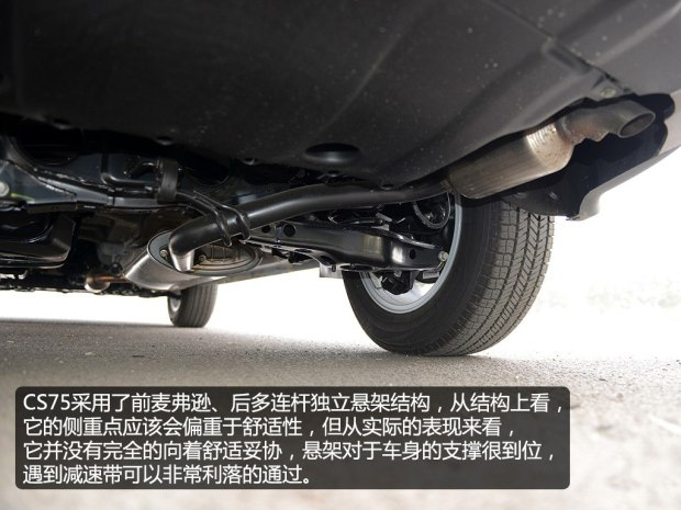 CS75采用了前麥弗遜、后多連桿的懸架結構,懸架對于車身的支撐也比較到位。不過,對路面上細微顛簸的過濾效果不夠好。這種感受在鋪裝路面上時并不明顯,當遇到一些較為復雜的路況時,例如路面的石子或細微的顛簸較多時,會覺得懸架調校的還是有些偏硬,對于路面這些反饋沒有做到有效的過濾,對于車內乘客舒適性會有一些影響。