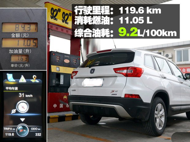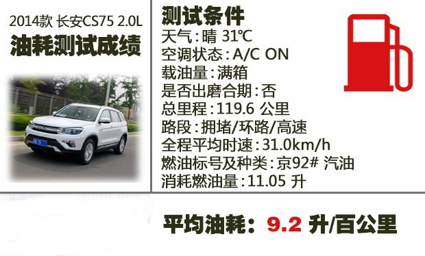 測試油耗環節,全程開啟空調,共行駛了119.6公里,平均時速31km/h,最終CS75 2.0L手動擋車型的油耗成績為9.2L/100km。它的油耗成績略低于我們的推薦值,并且對于這樣一款體型健碩的SUV來說,這個“飯量”完全可以接受了。