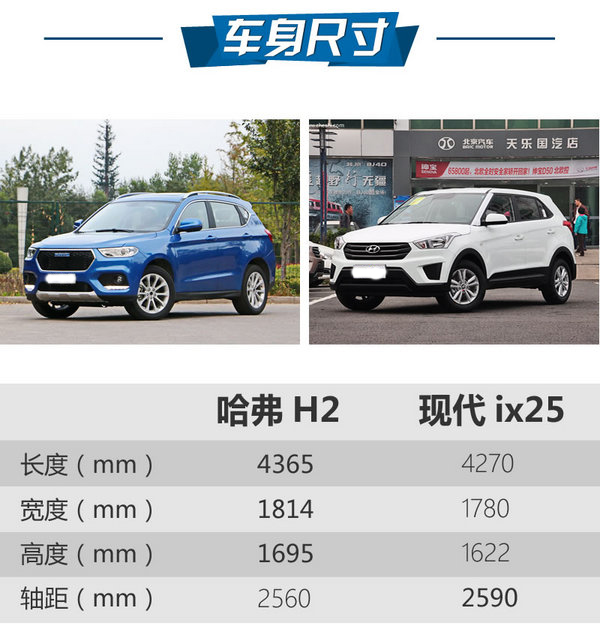 對比的兩款車選擇都是12萬左右的車款,H2可以買到頂配而ix25只能買到最低配,而且從市場價格來看,兩車的優惠幅度也很相似。所以就對比這兩個配置吧。