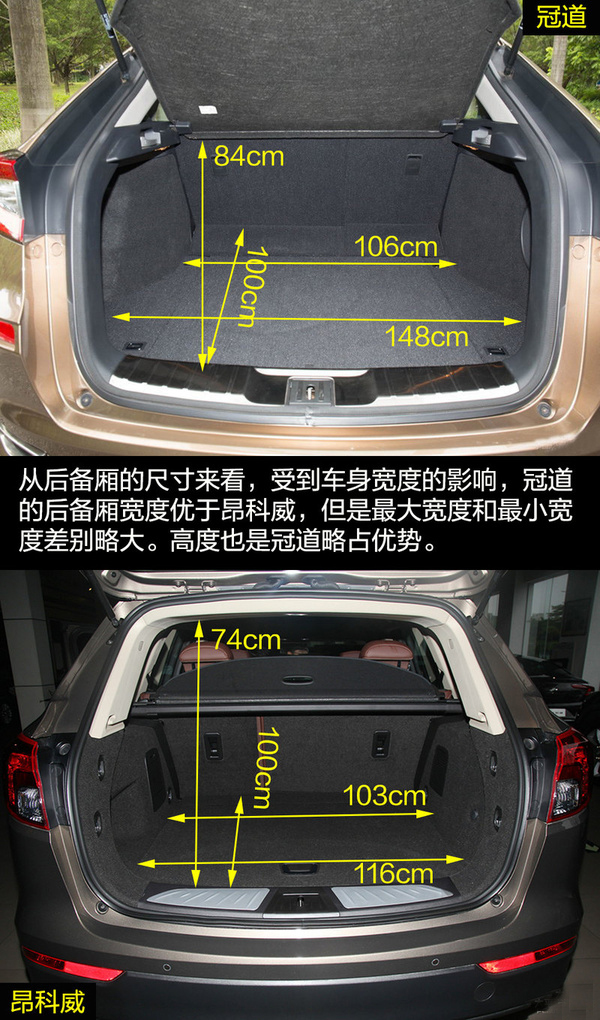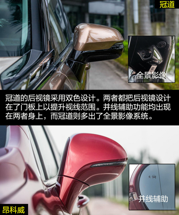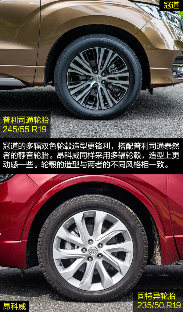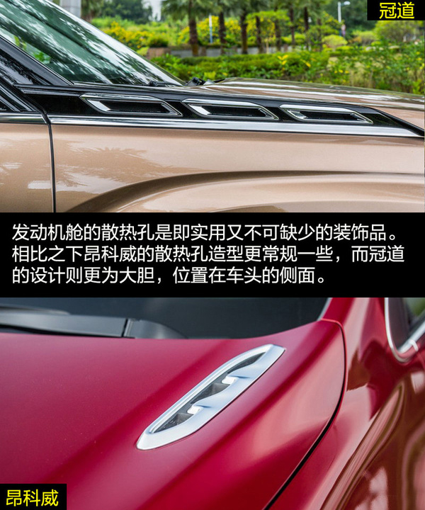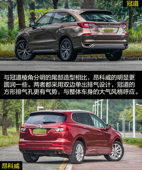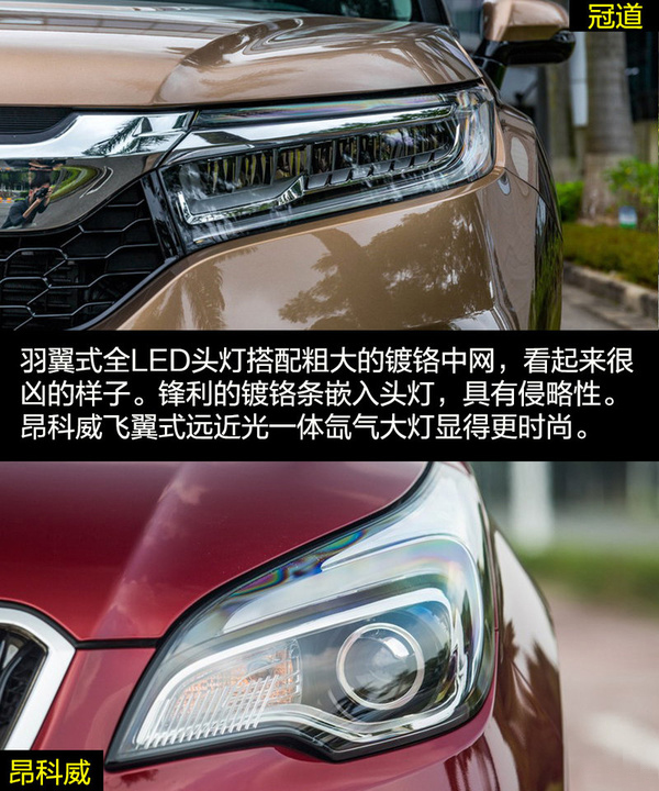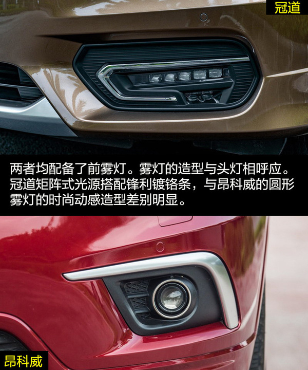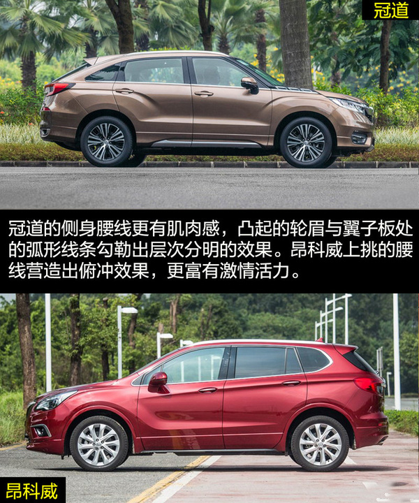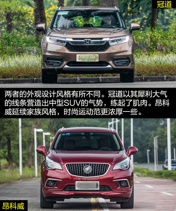 雖然兩者的定位都是中型SUV,但是在外觀設計上兩者的差距比較大,這也和各自的風格不同有關。冠道的車身更龐大,硬朗的線條與富有侵略性的頭燈讓冠道非常有氣勢,更多的展現出中型SUV的氣勢。昂科威因為將更多的目標放在了緊湊型SUV身上,較小的車身與時尚運動的外觀風格更合適。