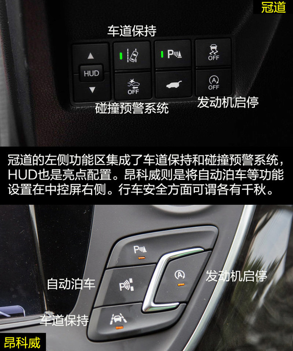 內飾配置方面,冠道略占優勢。安全配置兩者的表現都值得肯定,除了ESP和胎壓監測系統外,前/后排頭部氣簾、無鑰匙進入和一鍵啟動也都出現在兩者身上。昂科威還提供了陡坡緩降功能。冠道的自動駐車、HUD抬頭顯示和全景攝像頭是亮點。值得一提的是兩者在高科技配置上都下了很大的功夫,自動泊車、車道偏離輔助、自適應巡航等功能都沒有缺席。