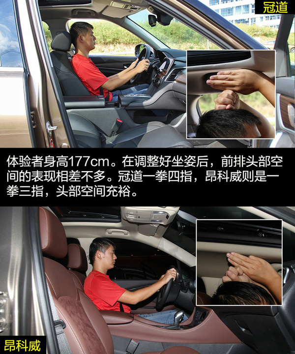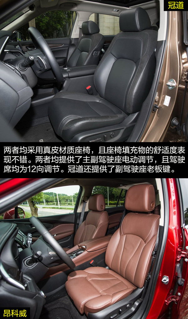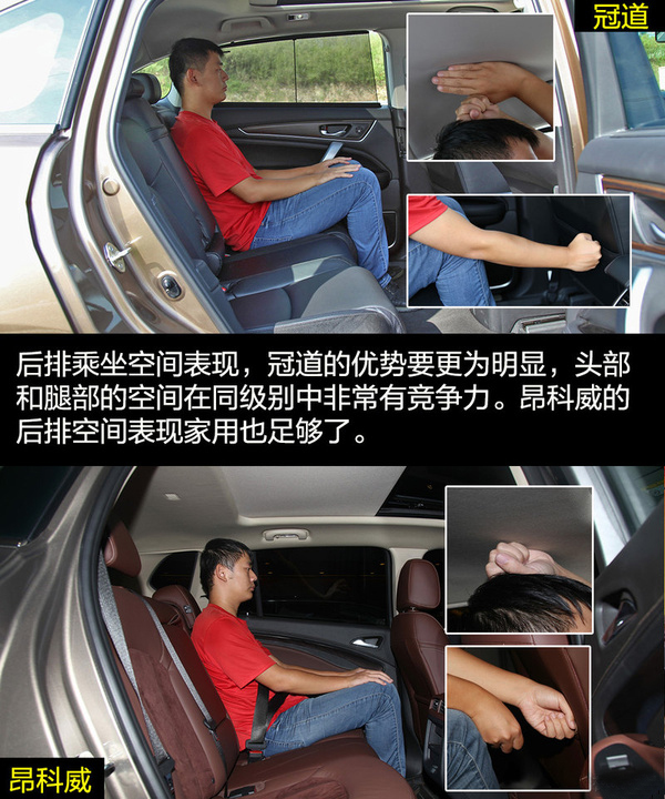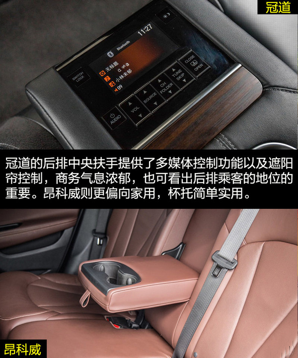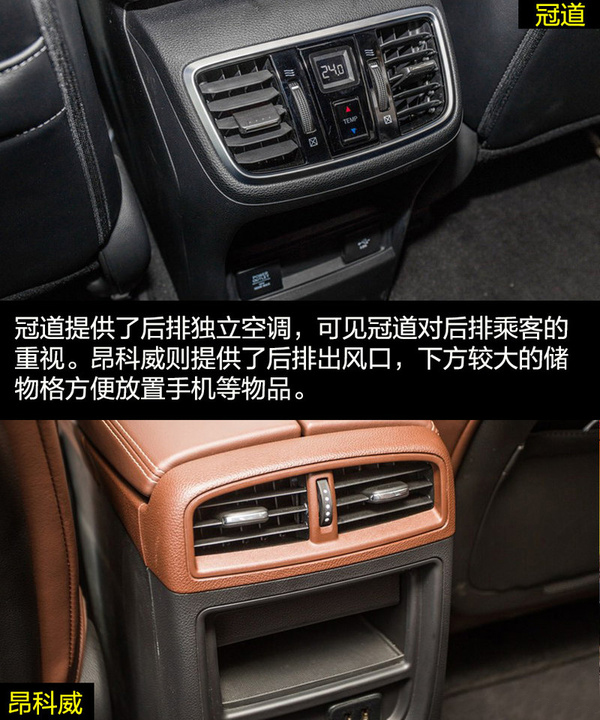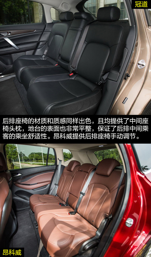 由于冠道更側重商務用途,因此在車身尺寸上冠道更有優勢,由此帶來的乘坐空間的差別也是明顯的。冠道的后排空間非常有優勢,同時從前排副駕駛的老板鍵、后排獨立空調、后排座椅加熱和后排中央扶手多媒體控制區等配置也可看出冠道對后排乘客的重視。昂科威的乘坐空間表現滿足家用綽綽有余,后排腿部兩拳有余的距離在中型SUV中的表現也是可圈可點的,同時后排座椅還支持靠背角度調節和座椅移動。
