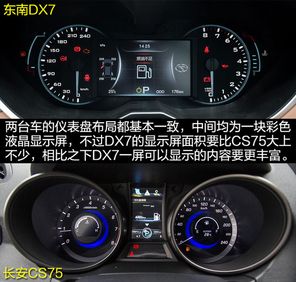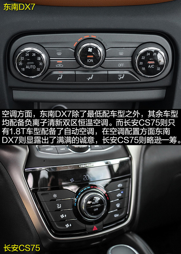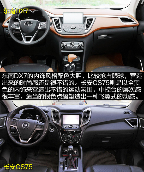 內飾方面,東南DX7完全是一派活潑的年輕氣息,雙色的中控看上去挺有質感。而長安CS75則是強調全黑色的運動氣息,在方向盤的縫線等處均低調地透露出了其特性。