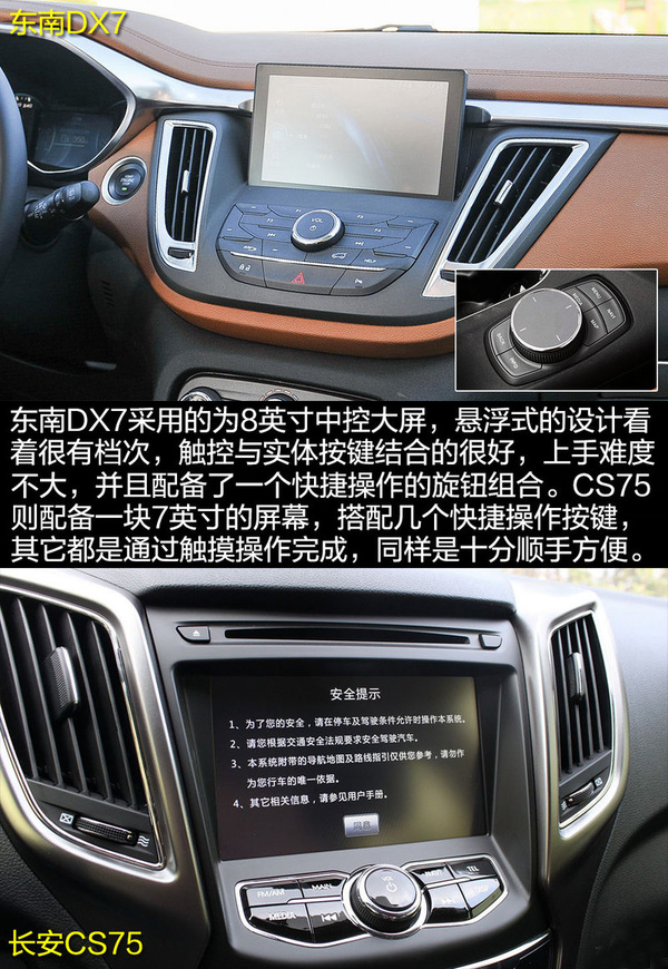 東南DX7配備8英寸大屏,并且還具備在線服務的網絡連接功能。長安CS75則是7英寸大屏,新增加了一套in Call智能車載互聯系統,提供了手機遠程連接控制的支持。