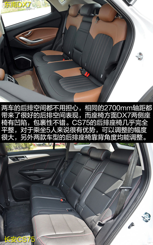 前排的空間就不多說了,對于大家最為關注的后排空間,DX7和CS75都能夠交出讓人滿意的答卷,絕對夠用。