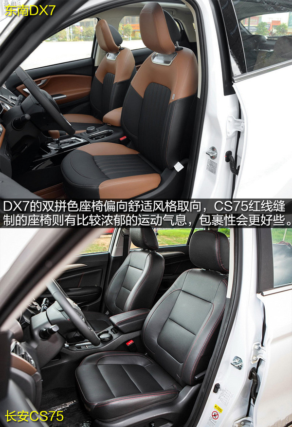 座椅方面,東南DX7同樣是雙拼色的皮質裝飾,座椅厚實偏向舒適性的取向。長安CS75的座椅則采用了紅線縫制,運動氣息濃郁,同時包裹性方面也比DX7要稍好,偏向運動化的感覺。