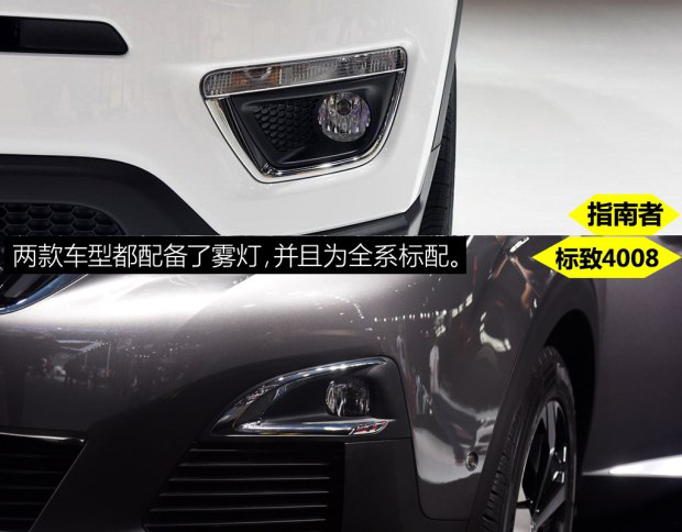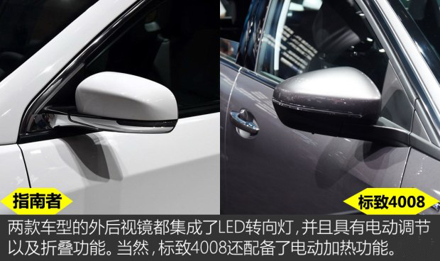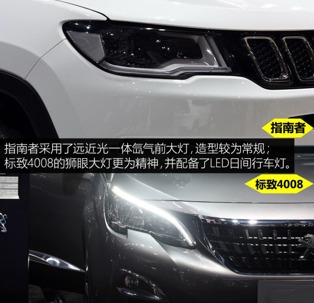 在前臉細節方面,兩款車型的前大燈造型和各自的氣質還是比較相符的。指南者的遠近光一體氙氣前大燈規規矩矩,而標致4008則前衛很多。兩者的功能都很齊全,高度可調、自動點亮或熄滅等功能均有配備。