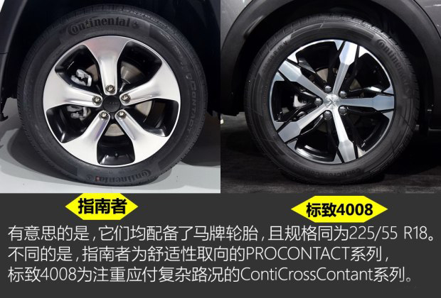 本次兩款展出的車型配備的輪胎所采用的品牌和規格都是一樣的,18英寸的輪圈在這個級別里已經足夠有視覺沖擊力了。另外,它們的輪圈樣式相似度也很高,均為五輻式,標致4008稍微更顯花哨。