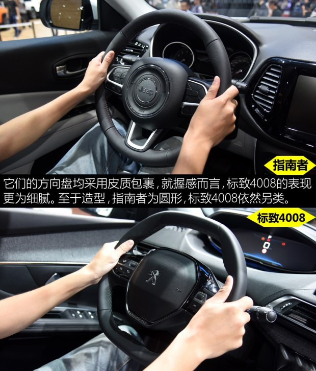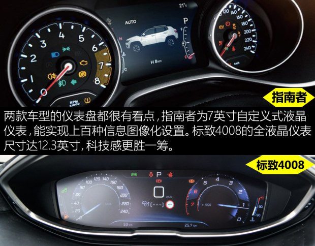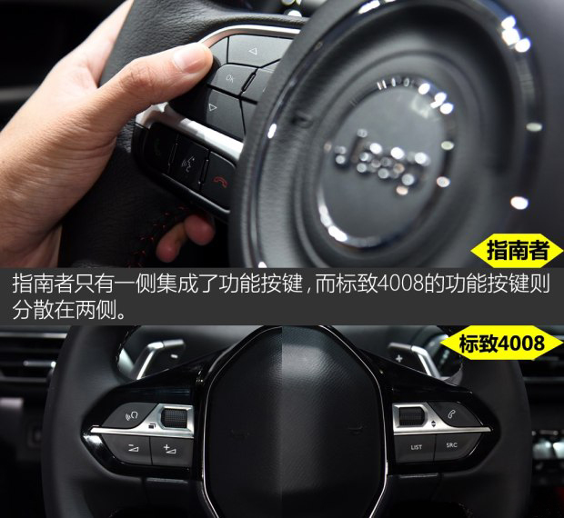 指南者的圓形方向盤相信大家都非常熟悉了,雖然采用皮質包裹,可握感偏硬,上面集成了藍牙電話以及行車電腦菜單控制按鍵。標致4008的方向盤感覺像是游戲手柄,十分酷,握感更出色,上面集成了功能按鍵與指南者一樣,只不過分散在兩側。至于儀表盤,盡管標致4008展現了與眾不同的科技感,可如此前衛未必能被大多數人接受,而相比之下,指南者的風格就穩妥許多了。